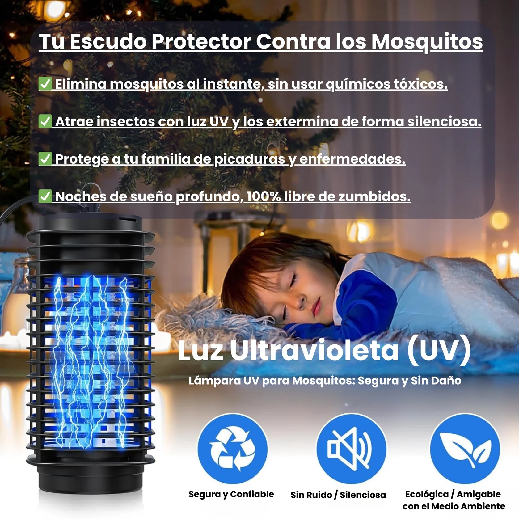 Este no es un simple matamosquitos. Es un sistema de defensa inteligente que utiliza una luz UV científicamente probada para atraer a los mosquitos y otros insectos voladores, y luego los elimina al instante con una descarga eléctrica rápida y silenciosa. Es la forma moderna de recuperar tu espacio sin usar químicos peligrosos.